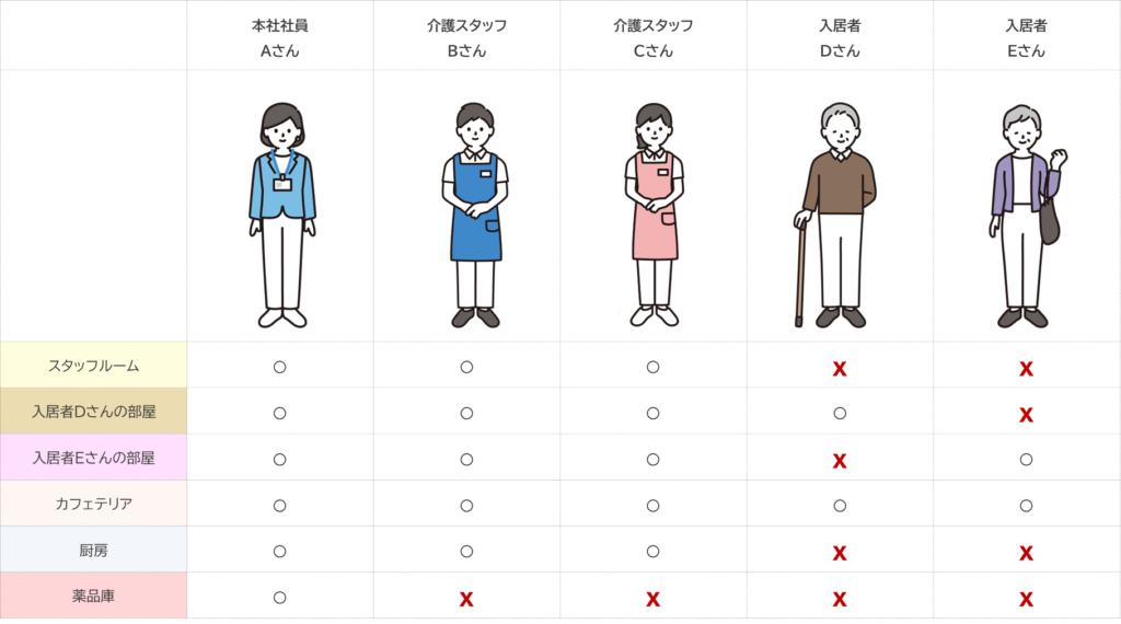 同じ職員でも、薬品庫へは本社社員のAさんのみが入室可能です。
